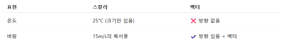 - 반면, 벡터는 크기와 방향이 모두 있는 수예요. 예: 시속 80km로 동쪽 방향 이동
