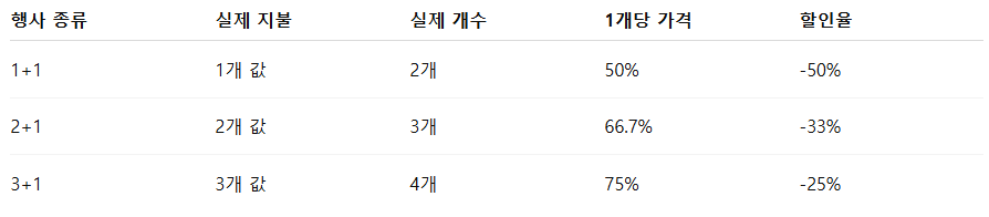 이렇게 보면, 사실 1+1이 가장 할인율이 크고, 3+1은 덜 싸다는 걸 알 수 있습니다.